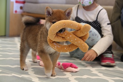 出されたおもちゃをすぐに咥えて楽しむマロンちゃん( ^ω^ )